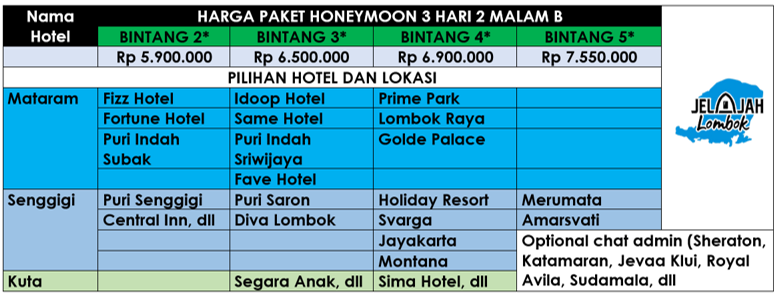 Daftar Harga Paket Honeymoon 3H2M Terhitung Per Couple/Berdua Paket B