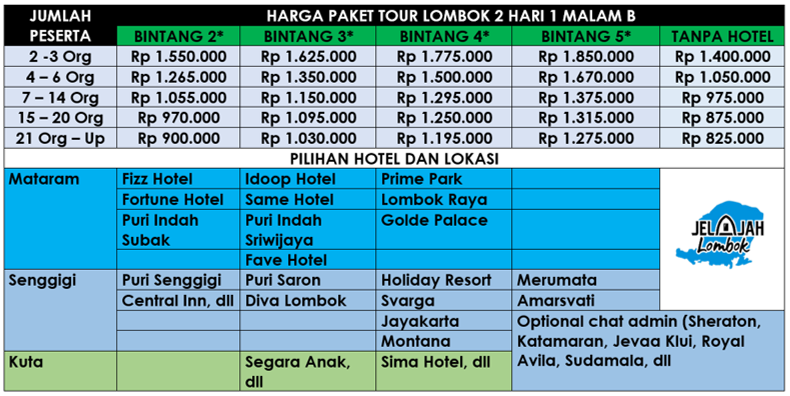 Daftar Harga Paket Tour Lombok 2H1M Terhitung Per Orang Paket B
