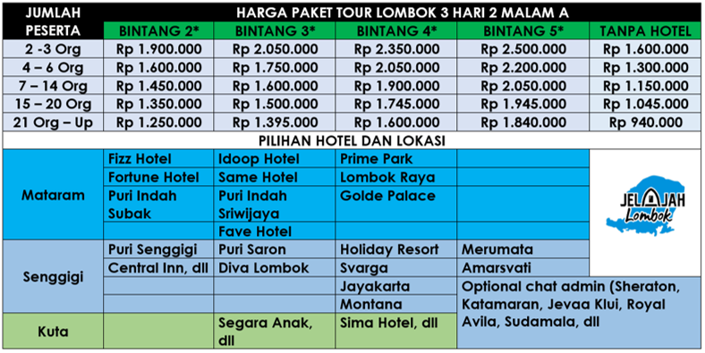 Daftar Harga Paket Tour Lombok 3H2M Terhitung Per Orang Paket A