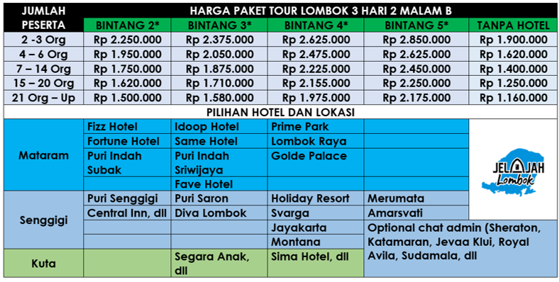 Daftar Harga Paket Tour Lombok 3H2M Terhitung Per Orang Paket B