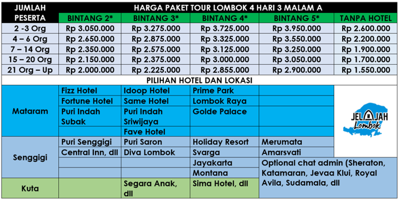Daftar Harga Paket Tour Lombok 4H3M Terhitung Per Orang Paket A